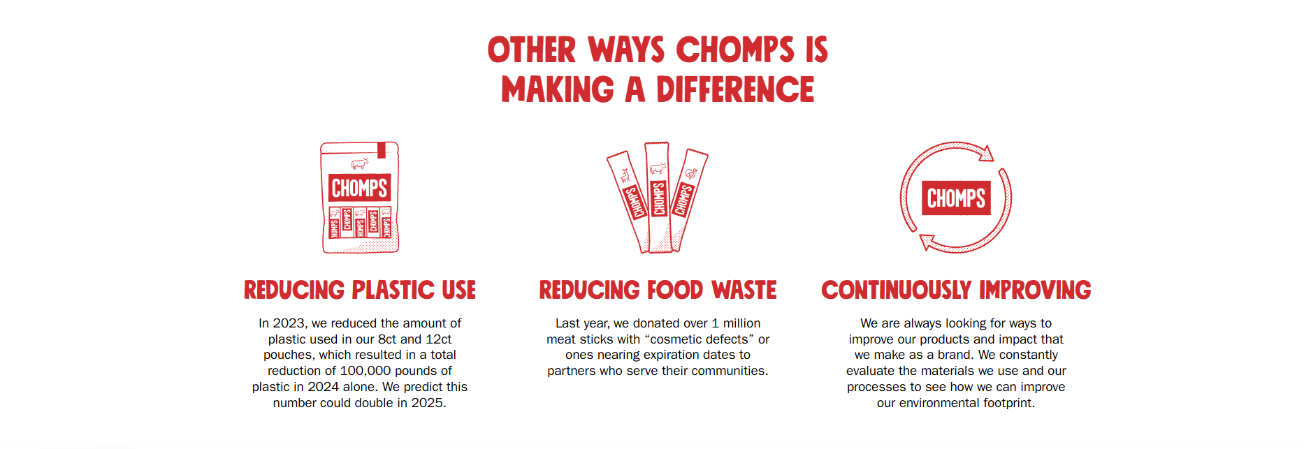 A major contributor to this plastic pollution are single-use plastics which are used in many food products, including Chomps. While we continue to explore other packaging options in the future, there is currently no immediate alternative available. Chomps understands its role in creating waste and wants to be a leader in offsetting it.